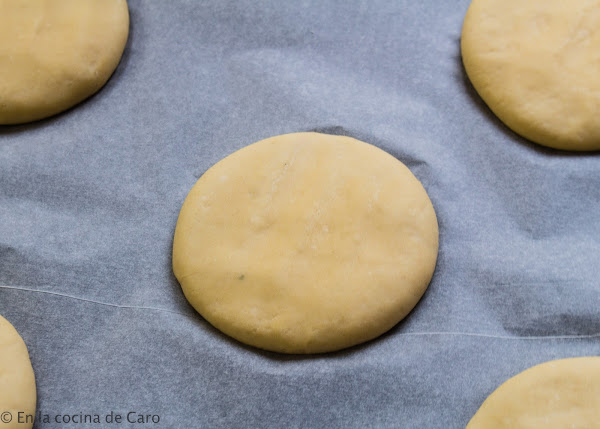 Damos forma de bola y ponemos a leudar sobre papel de horno, aplastamos un poquito con la mano. Volvemos a dejar que dupliquen su tamaño, más o menos una hora.