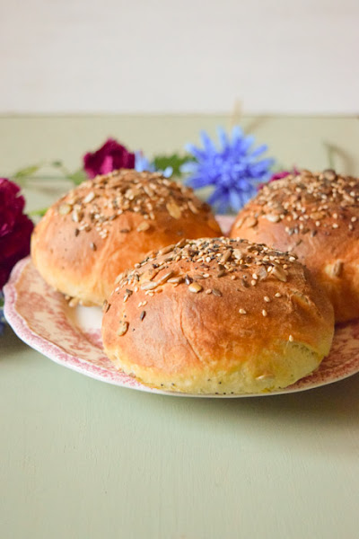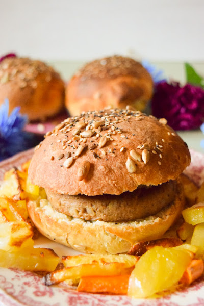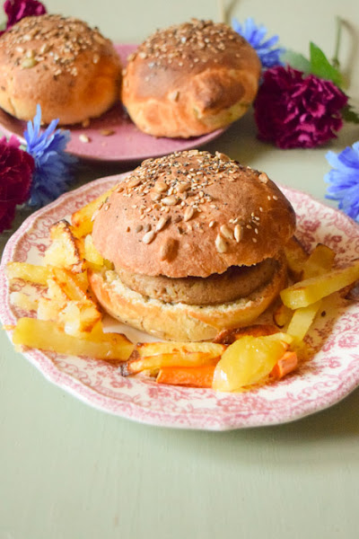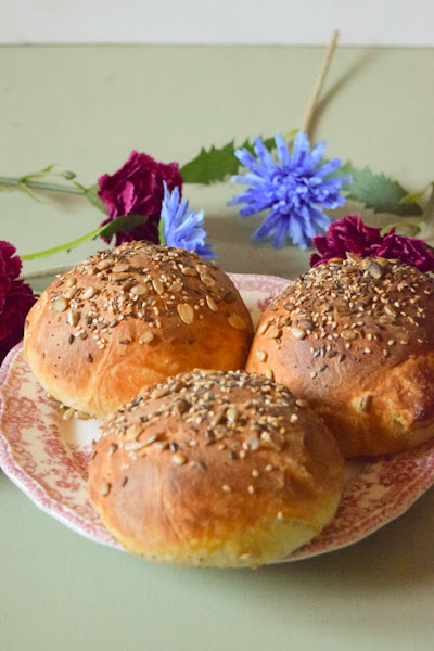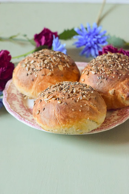 Con las cantidades que os doy os da para hacer 3 bollos de unos 200 g aunque si lo preferís podéis hacerlos mas pequeños, todo dependerá del tamaño de vuestras hamburguesas. Yo por encima le he puesto una mezcla de semillas, pero podéis ponerle lo que prefiráis, sésamo, semillas de amapola....