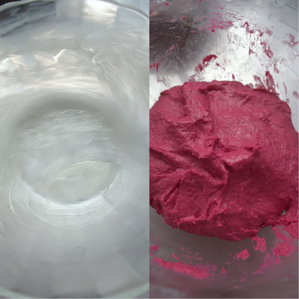 Grease a bowl qith some butter, grease your hands as well, take the dough and place it into the bowl. Cover with ling film, and let rise for 1 1/2 h. or 2 h. until doubled size.