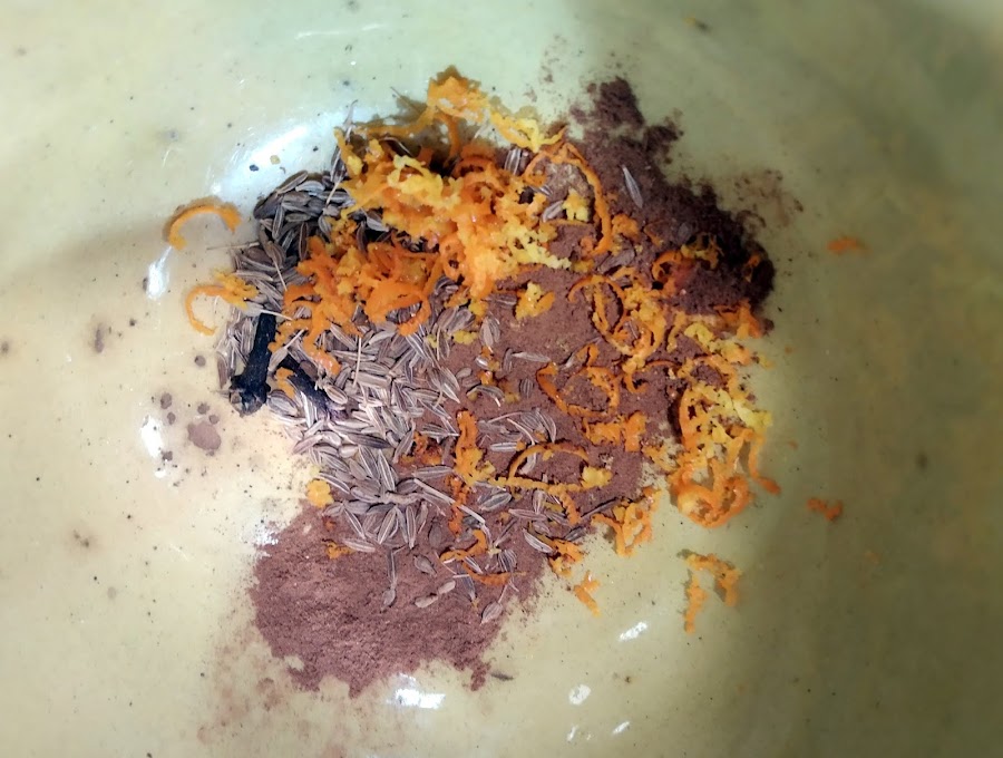 En un mortero echar la canela, los dos clavos de olor, una cucharada mediana de ajonjolí, la ralladura de naranja y la matalahúva, machacar de forma que queden los clavos y la matalahúva como si de una pasta se tratara; agregar a continuación las almendras fritas, dejando unas unas cuantas para decorar el pan de higo. Machacar de forma que queden las almendras con trocitos pequeños.