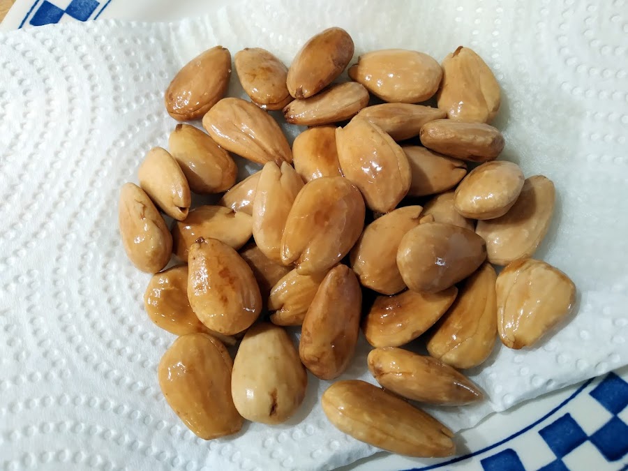 Las almendras que sean marconas, así no amargan y personalmente me gusta añadirlas fritas en aceite de oliva virgen extra, le da un sabor muy especial; aunque éste paso se puede omitir comprándolas ya fritas e incluso añadiéndolas crudas.
