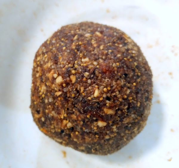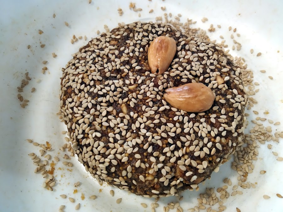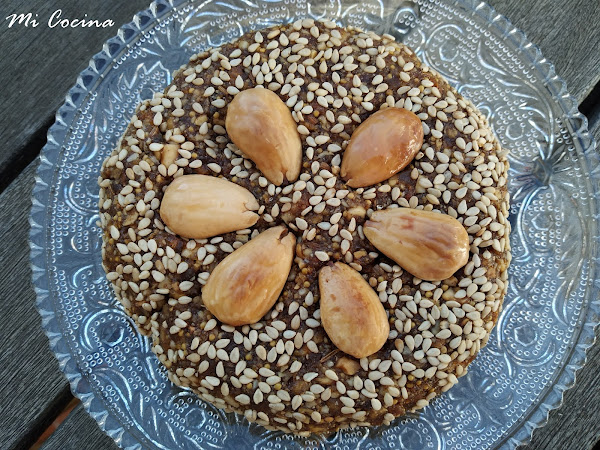 Dejar reposar unos minutos y a continuación formar un cilindro o torta bien compacta. Emborrizar el pan de higo en ajonjolí colocando posteriormente las almendras fritas enteras.