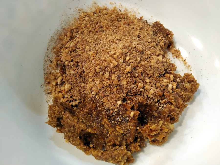En un cuenco echar los higos picados, la copa de aguardiente, las almendras machacadas con las especias e ir mezclando con las manos hasta que los ingredientes queden totalmente integrados y se consiga la consistencia deseada. Prensarlo con las manos y redondearlo.
