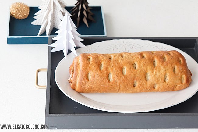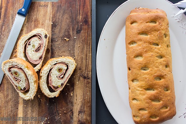 Colocar el relleno. A un centímetro del borde colocar una tras otra una hilera de aceitunas sin dejar espacio entre ellas (eso garantiza que cada rebanada que corte obtendrá una hermosa aceituna en centro). Cubrir con el jamón toda la superficie de masa (menos 10 cm para el adorno). Distribuir las pasitas sobre el resto del jamón. Colocar la(s) tira(s) de tocineta en forma diagonal desde la esquina superior izquierda hacia la esquina inferior derecha. Enrollar desde arriba hacia abajo el pan con cuidado de no remover las aceitunas de su lugar. Colocar el pan en una bandeja bien engrasada y dejar reposar tapado por 1 hora. Repetir el proceso con las siguientes porciones de masa. Pre-calentar el horno a 190 ˚C.