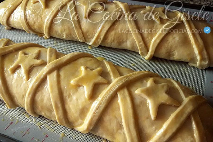 Apretamos las puntas para que no se derrame el contenido. Dejamos reposar los dos panes por 30 minutos antes de meterlo al horno el cual hemos calentado ya a 180°C Cuando el pan lleve en el horno 20 minutos, sáquelo y proceda a pintarlo con el papelón rallado, al cual le hemos añadido un huevo entero. (si no tienen papelón con el huevo solo basta) Luego hornéalo por 40 minutos mas. (total 1 hora)