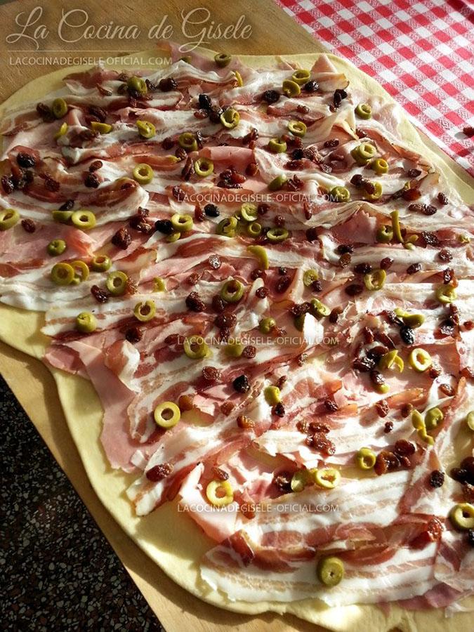 Sobre ese rectángulo colocaremos el jamón y la tocineta hasta cubrirlo completamente que no se vea ni un pedacito de masa. Agregamos las pasas y las aceitunas. Y como dice Claudio: Si es para venderlo pongale poco. Si es por placer y para quedar bien con su familia, póngale muchísimo.
