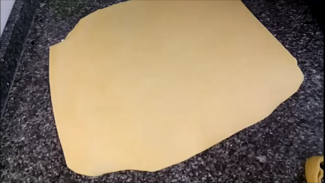 Una vez pasado este tiempo, ponemos nuevamente la masa en la mesa de trabajo y la aplanamos con las manos para sacarle el aire, y estiramos con un rodillo intentando formar un rectángulo que luego perfeccionaremos un poco con la ayuda de un cuchillo