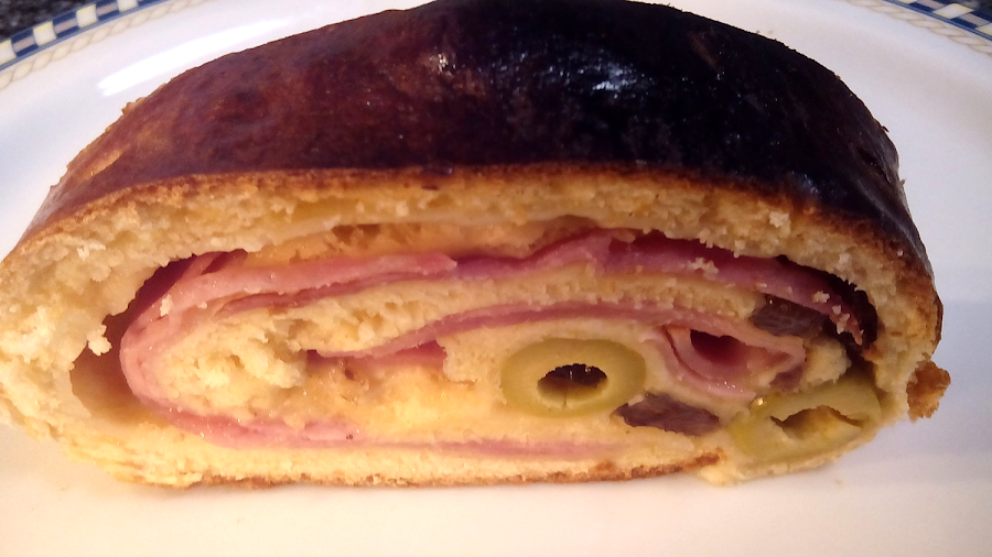 El Pan de Jamón es una especie de rollo de masa suave, relleno de jamón york o jamón dulce, bacon, aceitunas y pasas, y es uno de los principales protagonistas de nuestra mesa en estas fechas.