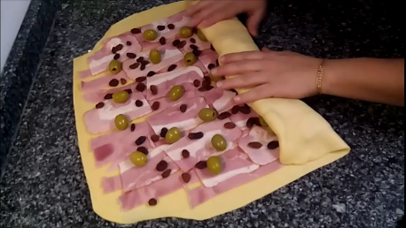 Ahora vamos a poner el jamón, el bacon, las aceitunas y las pasas y enrollamos como si fuera un brazo gitano