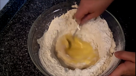 La sal la vamos a poner por un ladito encima de la harina y luego vamos agregando la harina tomándola de los bordes del "volcán" (con las manos bien limpias) y poco a poco la vamos a integrar ayudándonos con el tenedor hasta que empezamos a amasar con las manos.