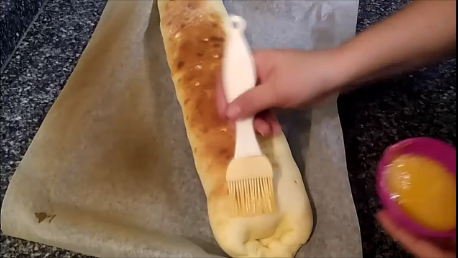 Esto lo llevamos al horno precalentado a 180ºC por unos 10 minutos. Mientras tanto, preparamos en un recipiente una mezcla de un huevo con 1 cucharadita de azúcar con la que pintaremos el pan pasados los 10 minutos. Esto es para que quede brillante y con un dorado uniforme.