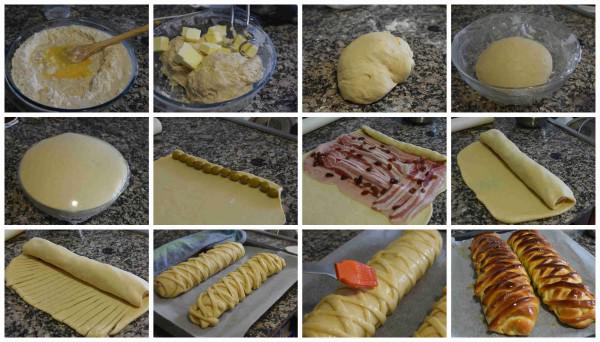 Colocamos las tiras sobre el pan de jamón venezolano, una tira si y otra no y luego colocamos las que tenemos en la dirección contraria, cruzándolas sobre las otras.