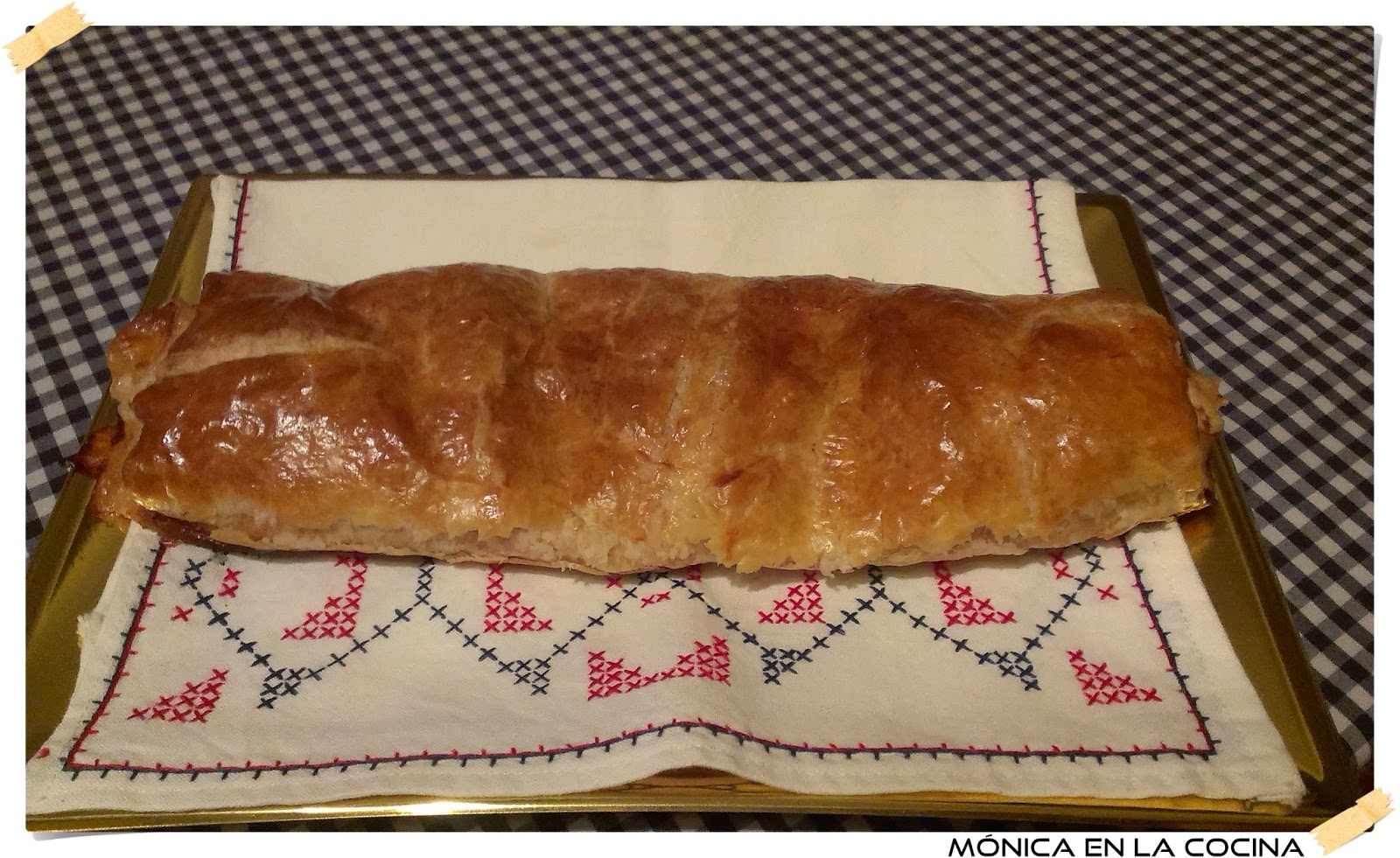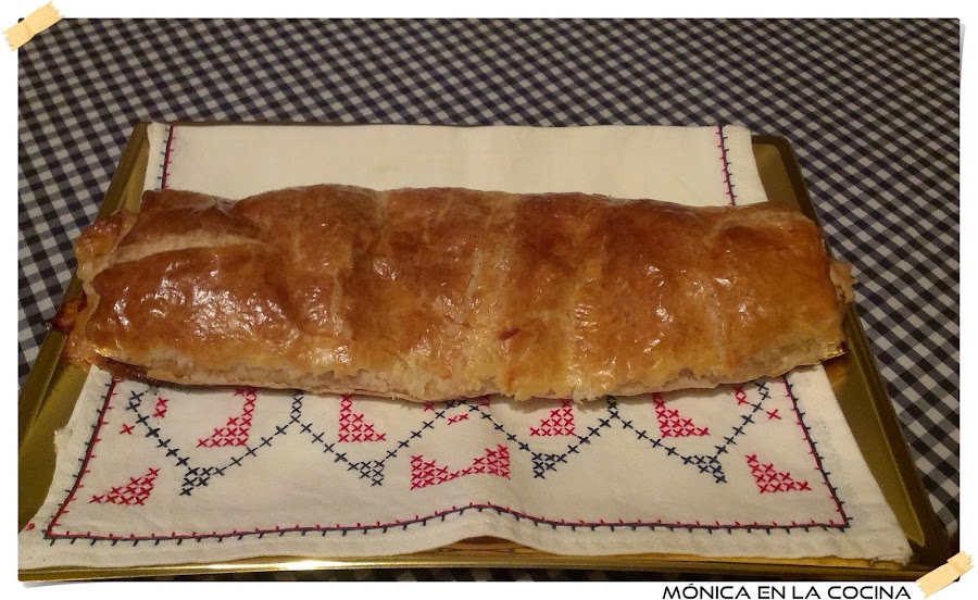 A continuación enrollar la masa apretando bien, como si fuera un brazo de gitano. Cerrar y pincelar con huevo batido.