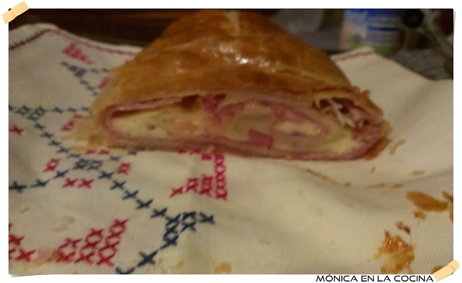 PREPARACIÓNExtender la lámina de masa de hojaldre y cubrirla con lonchas de jamón york. Sobre las lonchas de jamón york poner el queso y extender el resto de los ingredientes. Yo puse lonchas de queso Hawarti light y omití las olivas y las pasas porque en mi casa no hacen mucha gracia :)