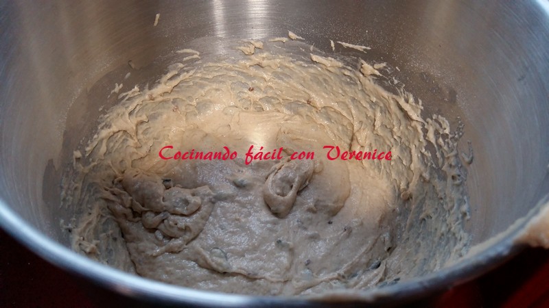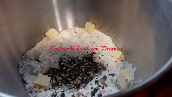 Ponemos en el vaso de la amasadora la harina, las especias, las semillas, la mantequilla y vamos incorporando el agua con la levadura fermentada poco a poco hasta amalgamar todo, velocidad fuerte, durante 10.