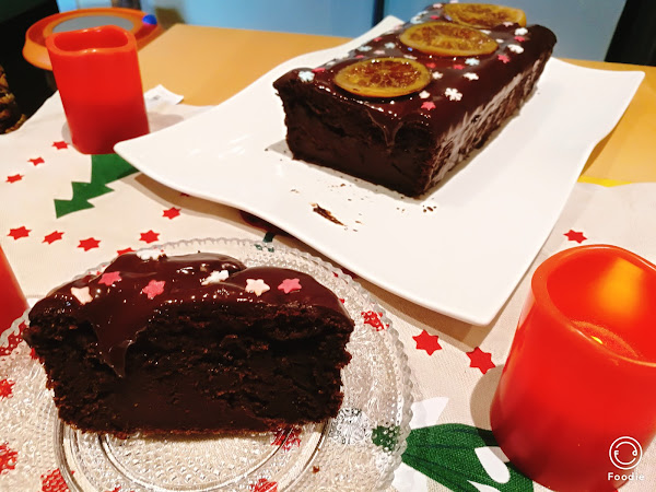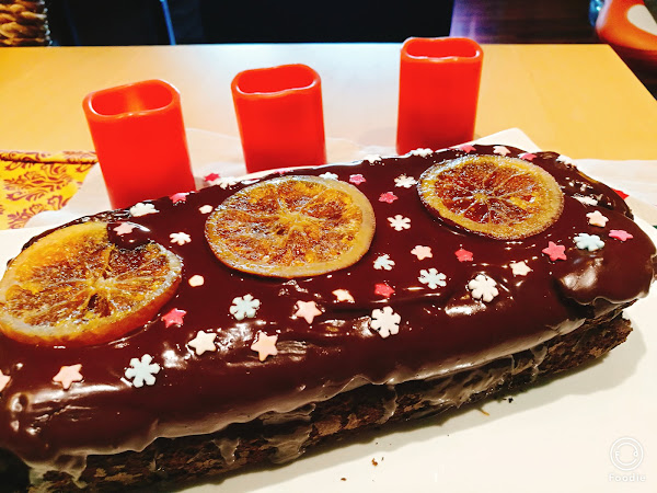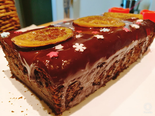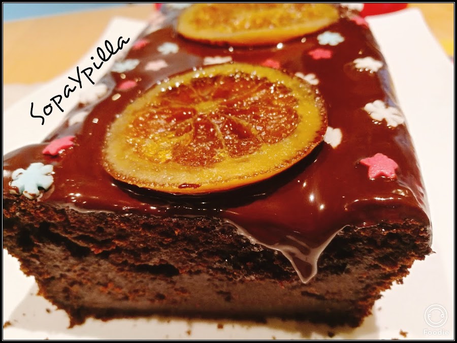 - Mientras se enfría, preparamos la cobertura, fundimos el chocolate con la mantequilla hasta que esté líquido y lo volcamos sobre el pan. Decoramos con lo que queramos, yo puse naranja confitada y chispitas