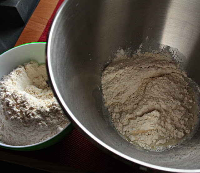Añadimos 1/3 de la harina y el agua.