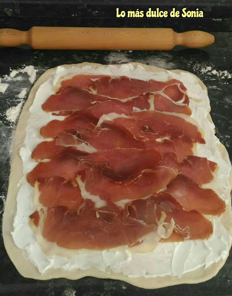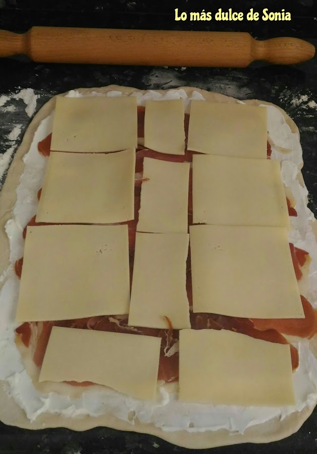 Cuando haya finalizado el tiempo de levado, estiramos la masa dando forma de rectángulo, untamos bien con el queso Philadelphia, ponemos las lonchas de jamón y encima el queso en lonchas.