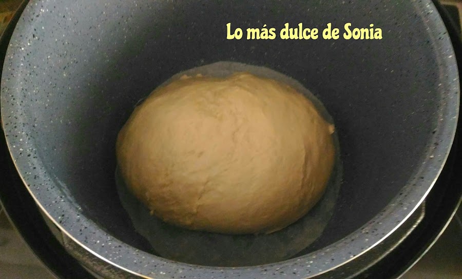 Formamos una bola con la masa y dejamos levar en un bon engrasado y tapado con papel film.