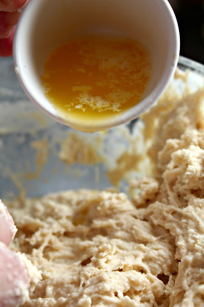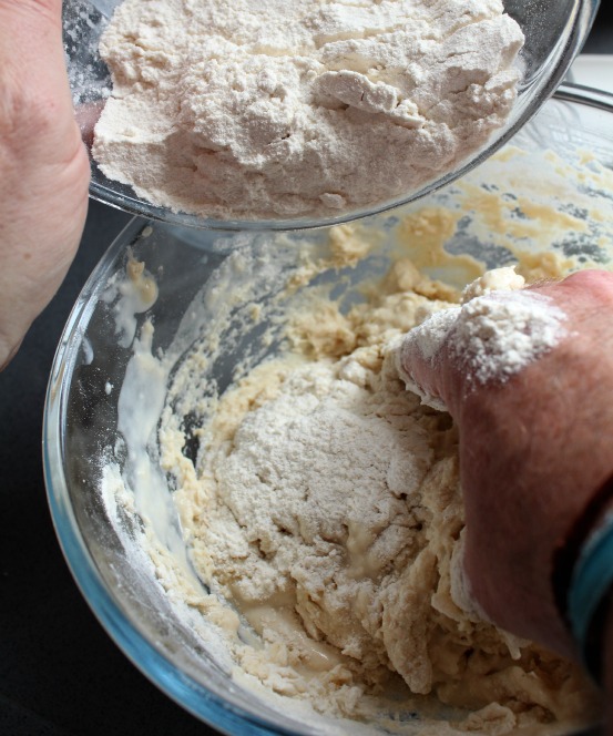 Añadimos la harina y la sal. Mezclamos con las manos hasta conseguir una masa ligera y pegajosa.