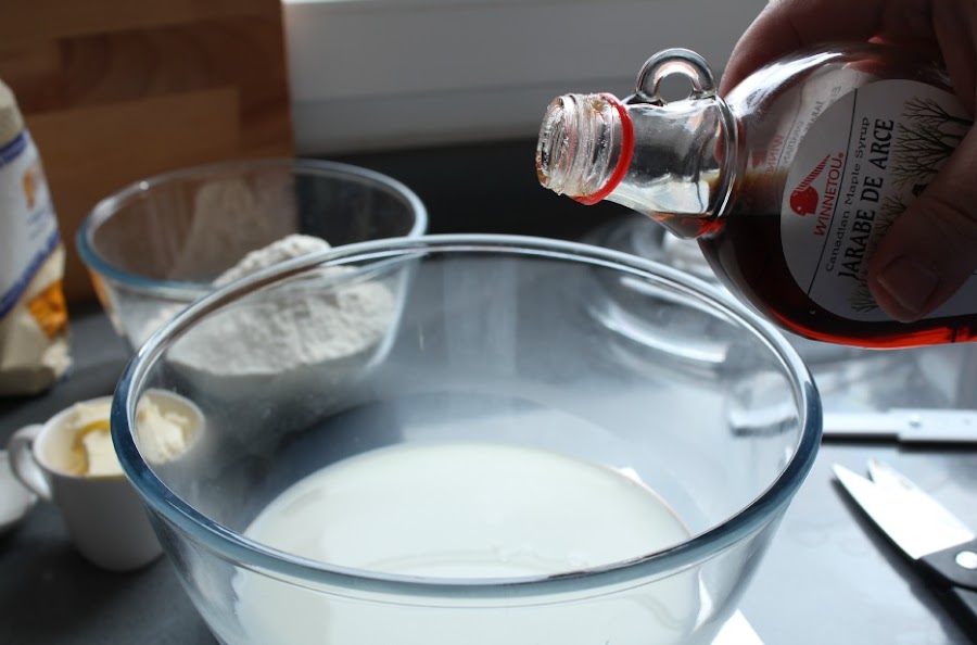 Mezclamos en un bol la leche, con el sirope y la levadura.