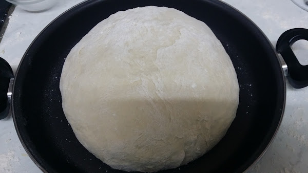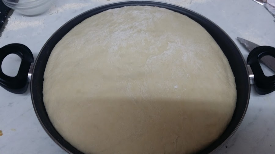 Pasado los 20 minutos se deja fermentar en un lugar templado (consejo: tapar la masa con papel film para que así no se forme costra en la capa externa de la masa) Dejamos que repose 2 horas.