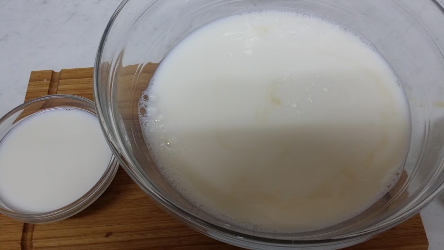 Para empezar usaremos la leche repartiendola en dos recipiente, ponemos un poco en un vaso (lleno) y otro en un bol. El poco de leche que esta en el vaso la entibiamos ( le quitamos el frio de la nevera con un golpe de calor sin llegar a hervir) para poder diluir la levadura.