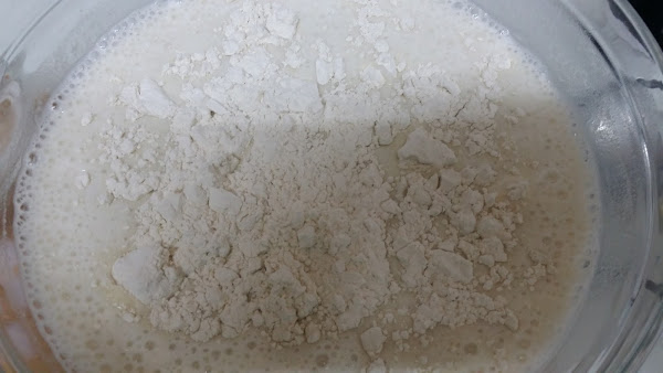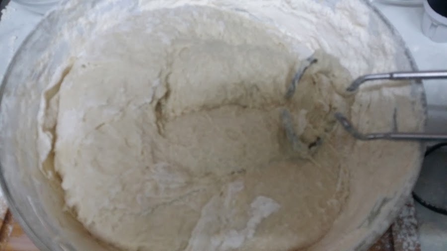 Entonces ponemos la leche con la levadura disuelta y mezclamos amasando hasta que quede todo ligado y con la misma forma homogénea de antes . (Si lo hacemos con una batidora que tenga las varillas de amasar nos facilita un poco el trabajo aunque no lo liga todo de una habrá que hacer un poco con la mano).