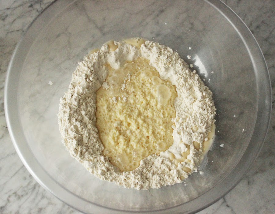 En un bol grande poner la harina y hacer un hueco en medio. Echar la mezcla de la leche con los demás ingredientes y empezar a mezclar con las manos.