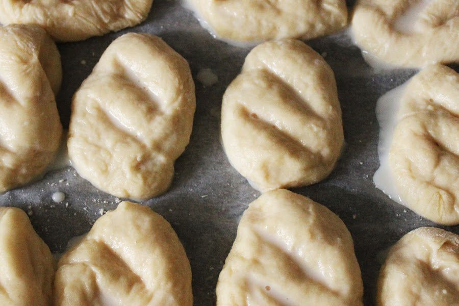Cuando haya pasado la hora pintar los panes con leche y hacer unos cortes.