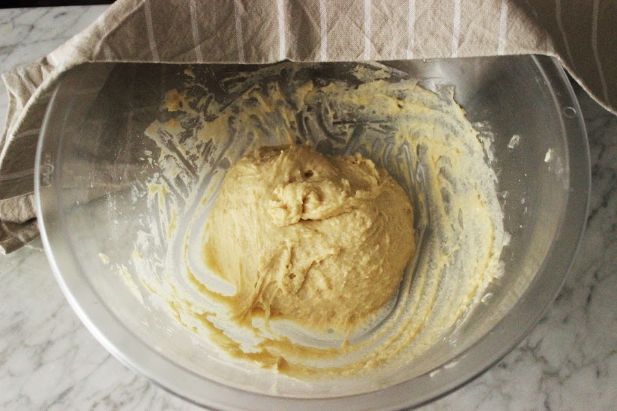 Amasar durante 10 minutos para que quede una masa fina y bastante pegajosa. Tapar con un paño y dejar levar durante una hora en un ambiente caliente y sin corrientes de aire.