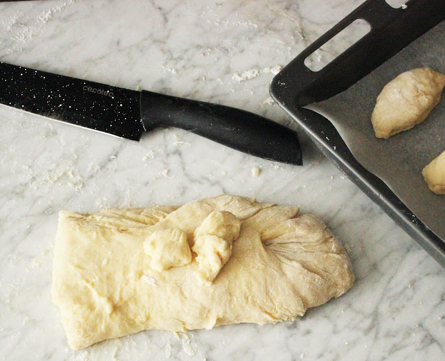 Sobre una superficie enharinada amasar un poco más y con las manos enharinadas también, cortar pequeñas porciones y colocar en una bandeja de horno, un poco separadas porque todavía van a crecer más de volumen. Volver a tapar y dejar levar una hora más.