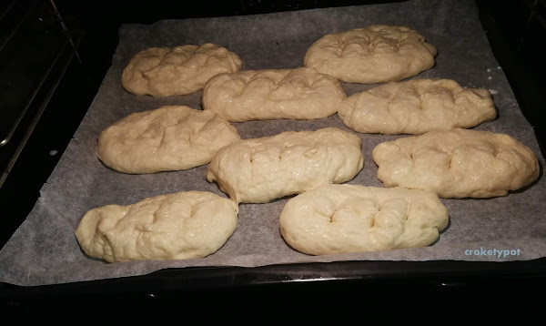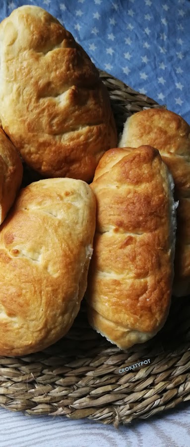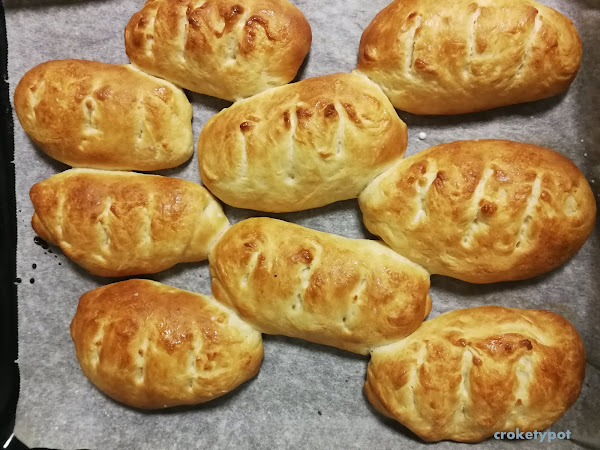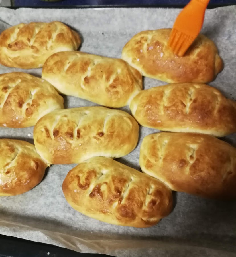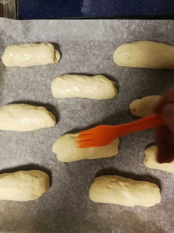 Las porciones las estiramos y plegamos enrollando la masa, le damos forma y lo ponemos en la placa de horno con un papel, dejamos en un lugar templado durante una hora para que doble el tamaño. Los pintamos con leche con un poco de azúcar y un poco de mantequilla.