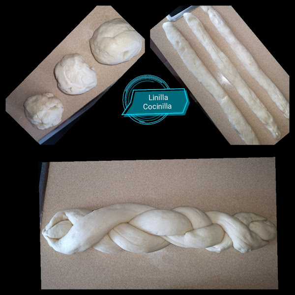 4. Forre una bandeja de horno con papel de hornear y reserve. Divida la masa en 3 partes y forme un cordón (aprox 45 cms) con cada una. Junte los 3 cordones por uno de sus extremos, trence y una el otro extremo.