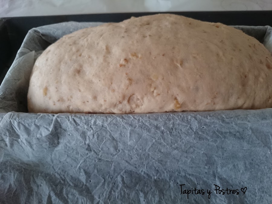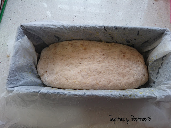 Sacamos y amasamos a mano, hacemos una bola y estiramos con suavidad para formar un cilindro. Colocamos en un molde de plum cake engrasado y dejamos reposar de nuevo unos 45 minutos.