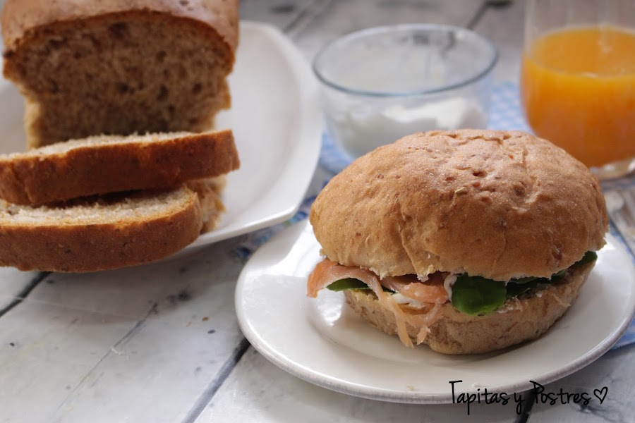 Y aqui veis el "bollito" bueno el bollo, porque creció hasta el tamaño de un mollete grande. Como sugerencia de desayuno lo podéis tomar con queso fresco, mermelada, aceite y tomate.. yo le unté queso fresco, y le añadí canónigos, rúcula y salmón ahumado. ¡Probadlo!