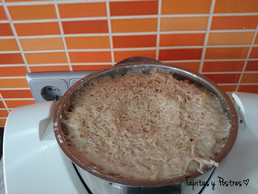 Dejamos reposar la mas dentro del vaso hasta que doble el tamaño, una hora mas o menos, según la temperatura ambiente.