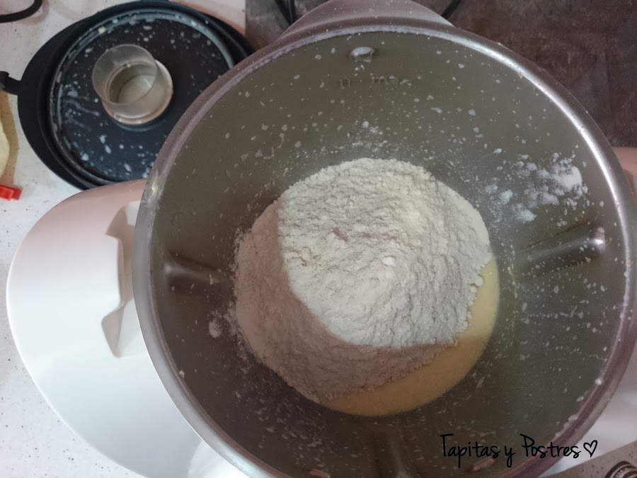Añadimos el huevo, la mantequilla, el azúcar, la sal y la harina y mezclamos 20 segundos a velocidad 6. Ahora amasamos dos minutos con el vaso cerrado a velocidad espiga.