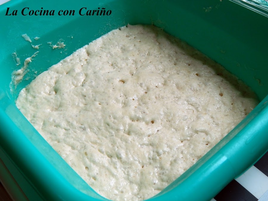Partimos de nuestra masa madre. Ya la tenemos así, que mezclamos la mitad de la harina, con 150 ml de agua tibia, 5 g. de levadura, 2 cucharaditas de azúcar y las 3 cucharadas de masa madre. Mezclamos, amasamos y dejamos fermentar 48 horas. Cuando lo destapemos, tendrá un aroma, brutal a levadura casera. El azúcar ayudará a poner las levaduras cardiacas.