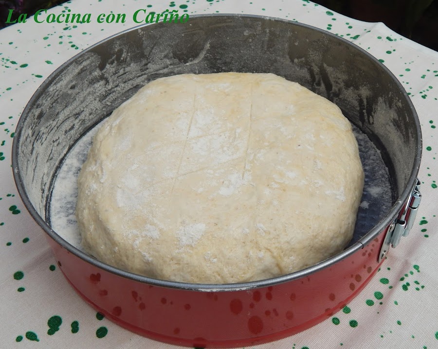 Pasado este tiempo, eliminamos el aire, apretando la masa y hacemos una bola. Para que no se nos desparrame, lo he puesto en un molde engrasado y con harina. Dejamos que duplique el volumen, unas dos horas más.