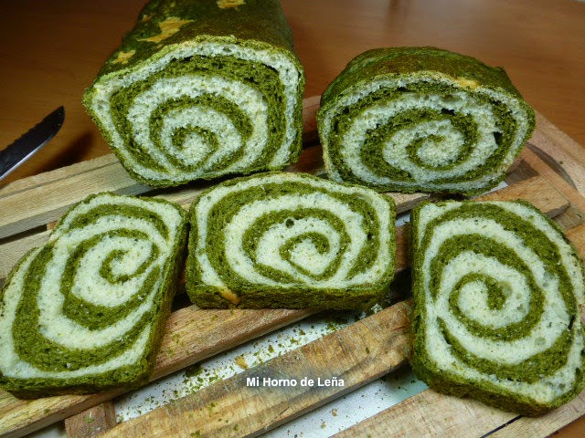 * Si queremos hacer el pan en espiral de dos colores, tenemos de dividir la cantidad de la receta en dos y a una mitad añadir el puré de espinacas en sustitución del líquido.