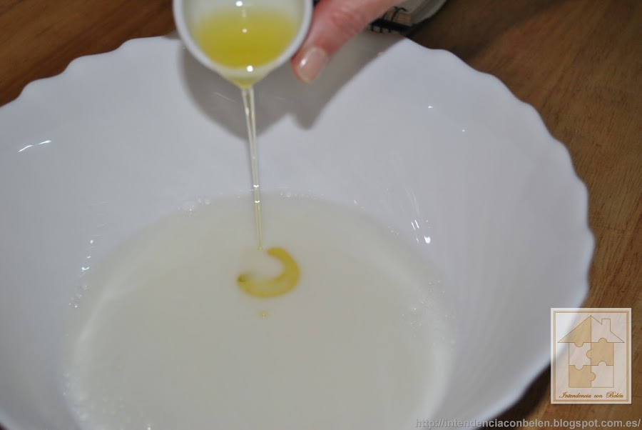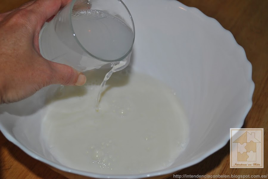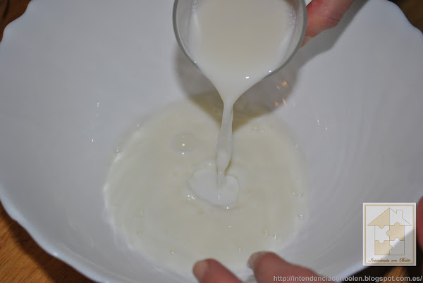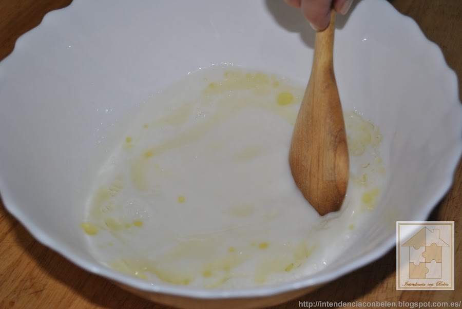 En primer lugar, echamos en un bol amplio, la leche, el agua y el aceite, y mezclamos hasta que todos los ingredientes estén bien unidos.