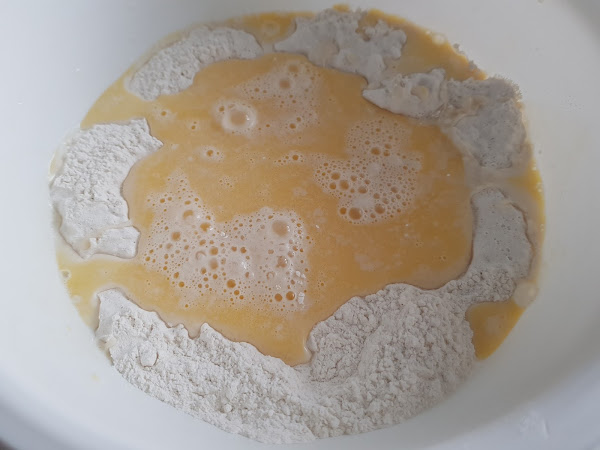 2. - En un bol ponemos la harina, el azúcar y sal, y le añadimos la mezcla anterior de la leche con la levadura.