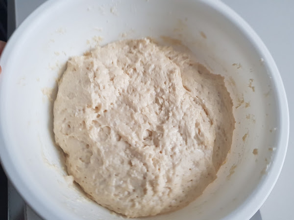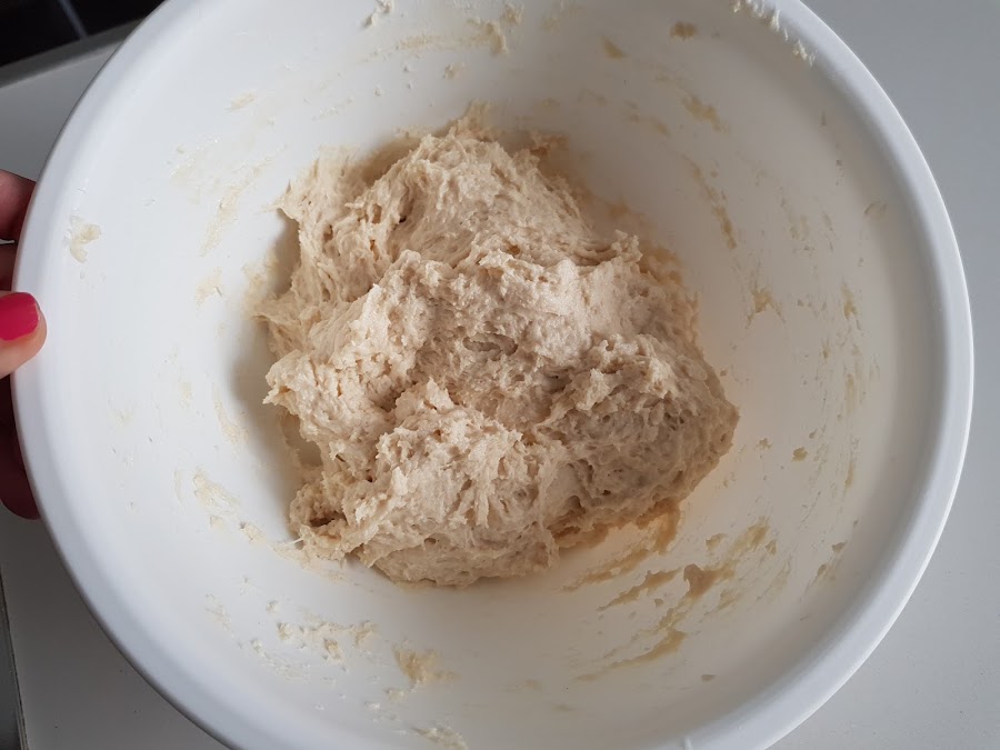 3. - Comenzamos a remover con una cuchara hasta que se despegue un poco de las paredes, aunque debe estar un poco pegajosa, y dejamos reposar, tapando con film o un paño, de una hora a dos, dependerá de la temperatura ambiente, hasta que doble su volumen.