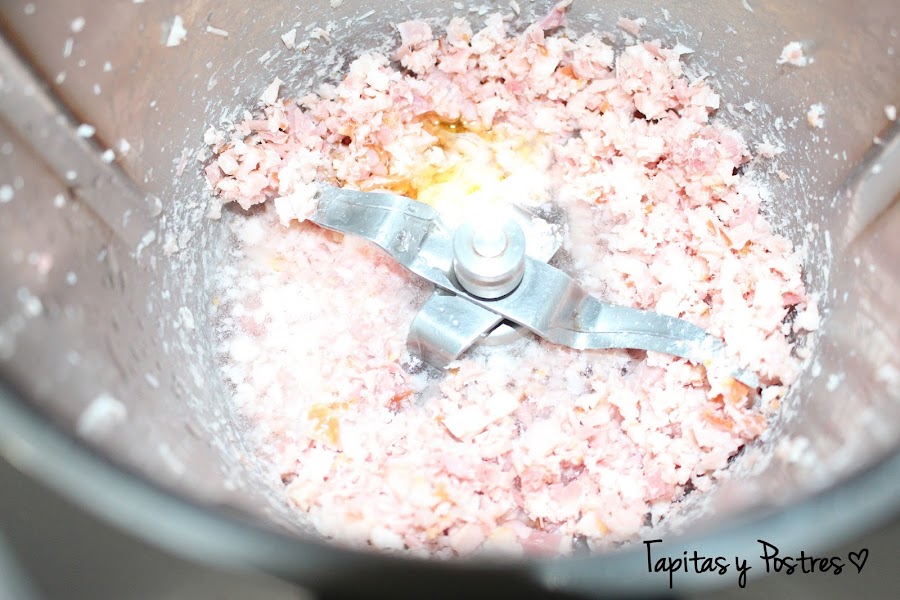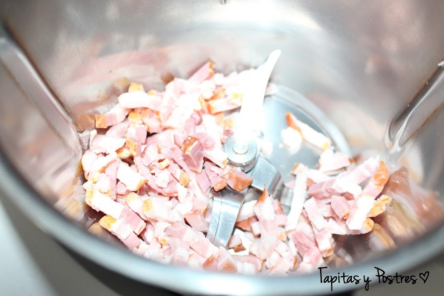 Vamos con la masa, trituramos el bacon en la thermomix 3 segundos a velocidad 6. Podemos hacerlo también con una picadora o hacerlo a mano con un cuchillo.