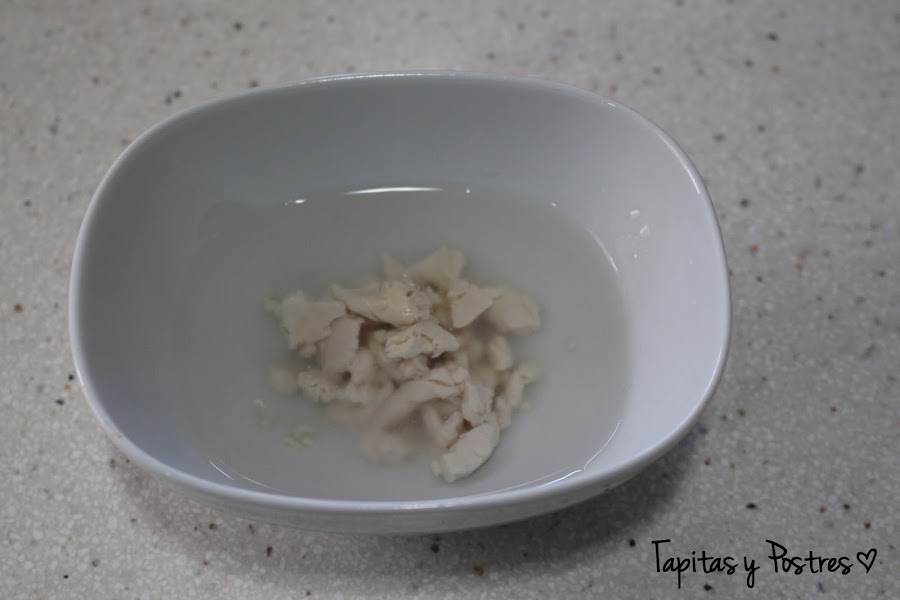 Primero preparamos el prefermento diluyendo la levadura fresca en 50 ml de agua templada. Dejamos reposar media hora.