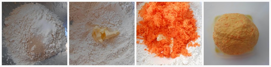 En otro bol colocamos la harina, el azúcar, la sal y la levadura. Añadimos la mantequilla mezclando bien. Incorporamos la zanahoria rallada. No le agregamos líquido, porque la zanahoria le aporta mucha humedad, aunque si fuera necesario, vamos añadiendo agua de a una cucharada por vez y amasamos hasta obtener una masa suave que no se pegue a los dedos. Engrasamos con aceite un bol y colocamos allí la masa. Cubrimos con papel film y la dejamos descansar a temperatura ambiente durante 45 minutos o hasta que doble su volúmen.
