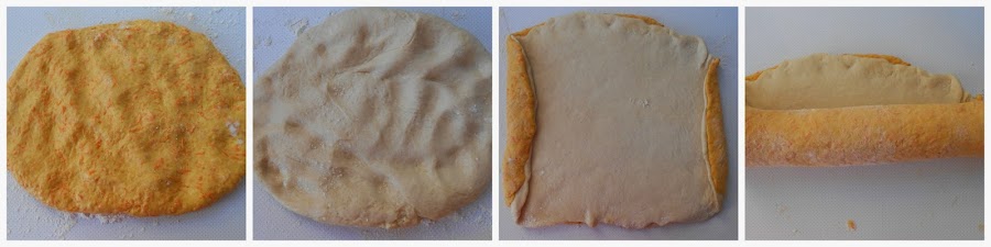 Cuando han leudado las dos masas, las colocamos de a una en la encimera enharinada y las aplastamos con los dedos para desgacificarlas, las etiramos con rodillo dandole forma rectangular y ponemos una masa encima de la otra, como en la imágen. Doblamos 1o 2 cm. los extremos y enrollamos dejando la unión por debajo.