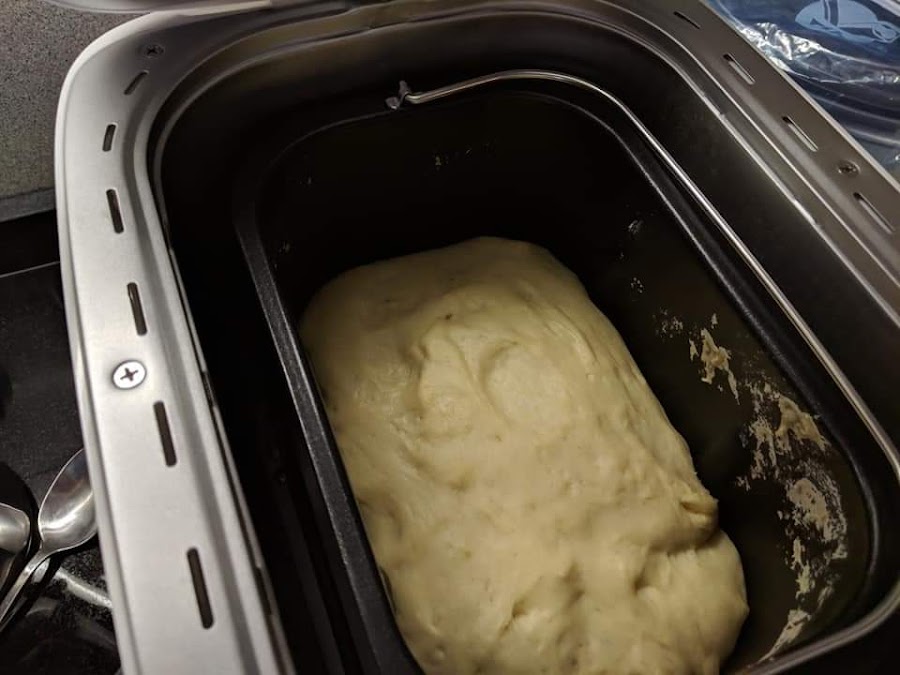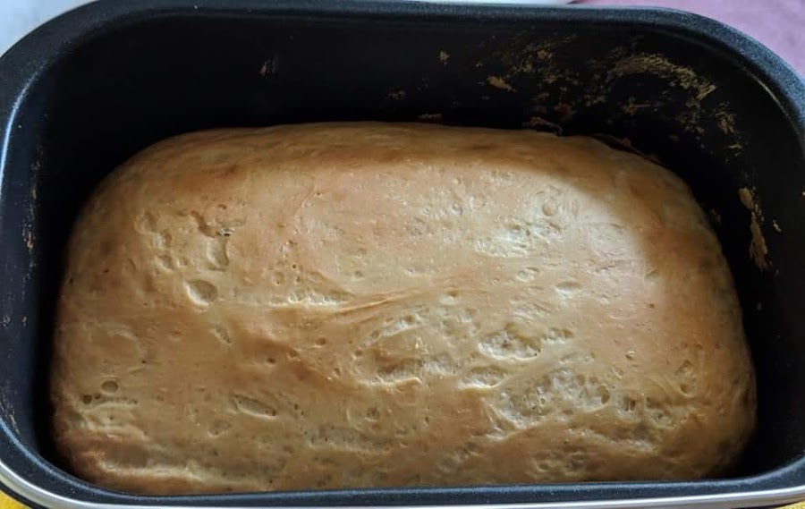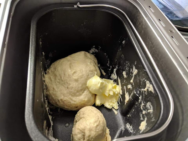 Programamos menú 4 y dejamos que actúe durante una media hora. Sin parar la panificadora añadimos la mantequilla en pomada o ligeramente fundida en el microondas