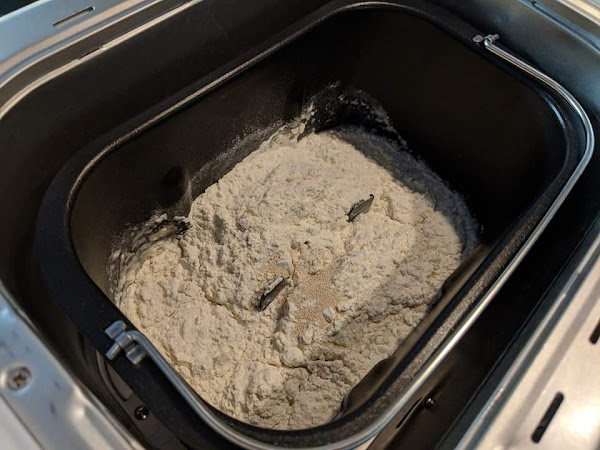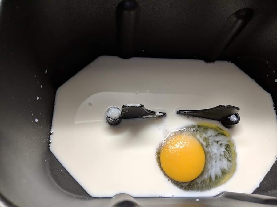 Ponemos en la cubeta de la panificadora el huevo, azúcar, sal, leche, harinas y levadura; en ese orden